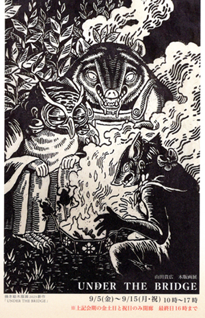 架空の世界をベースに物語を焼き絵にしてきた山田さんの、版画メインの作品展。