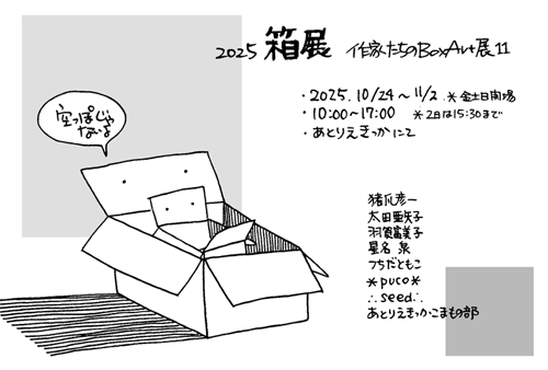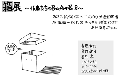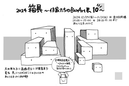 8回目の箱展。おたのしみに。出品は斎藤和行(日本画)、星野健司(彫刻)、星名泉(ガラス)、つちだともこ(版画)、*puco*(オーブン粘土)、あとりえきっかこまもの部。