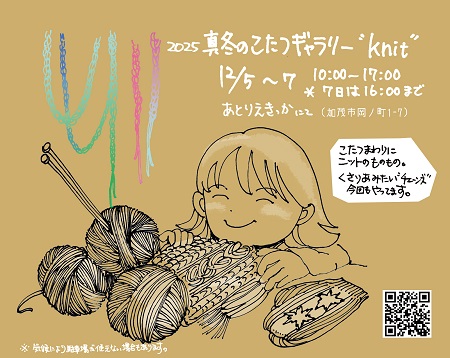 今年もこたつ周りで開催です。三条や新津でニットカフェを主宰する先生たちもメンバー。温かみのあるニットの品物とこたつでのあみあみ。おたのしみに。