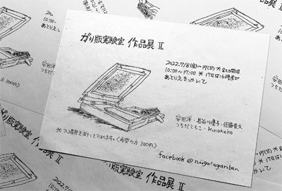 3回目のガリ版実験室作品展。この度は、、実験室のメンバーの作品とともに、ガリ版復興の旗手10-48net神崎智子さんの作品を展示させてもらいます。