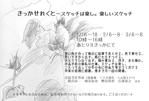 こたつ場でのスケッチ展。昨年から2回目の会。気候の読めない冬季の会です。急なお休み、駐車場のない場合もあります。