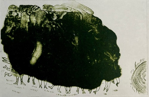 ウッドバーニングの山田さんの焼き絵を版にしての木版画展