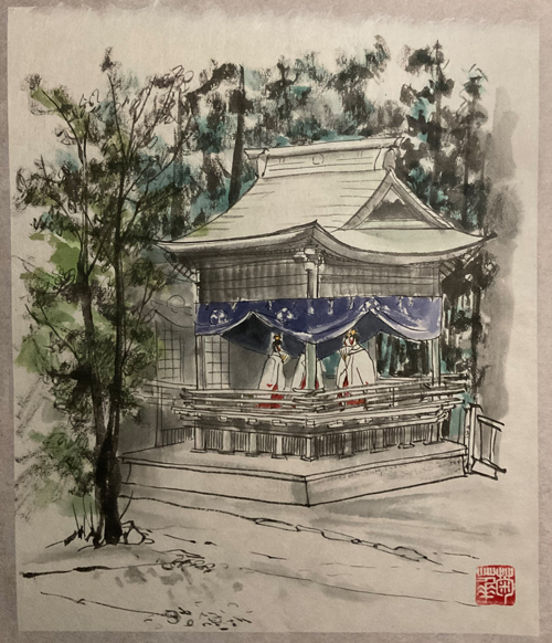画像はこの春に青海神社春季大祭用に描かせていただいた色紙です。加茂紙に描いたので印刷の際紙色まで再現するためご苦労だったとお聞きしました。