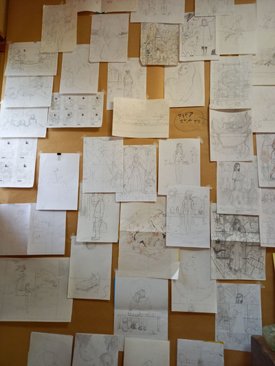 会場内には当初から「ラフとか下図を展示したい」とのことで、ラフをいっぱいはれるスペースを作りました。掲示板のように。