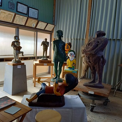 先生のアトリエは彫刻家の作業場然としていて、上から光が降ってくる天井の高いお部屋。そこに、先生の作品が並んでいました。