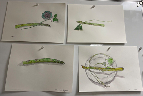 春一番のモティーフは、ミツハとアスパラガス。アスパラの紫と緑の微妙な取り合わせは、水彩絵の具にとってもあっている。